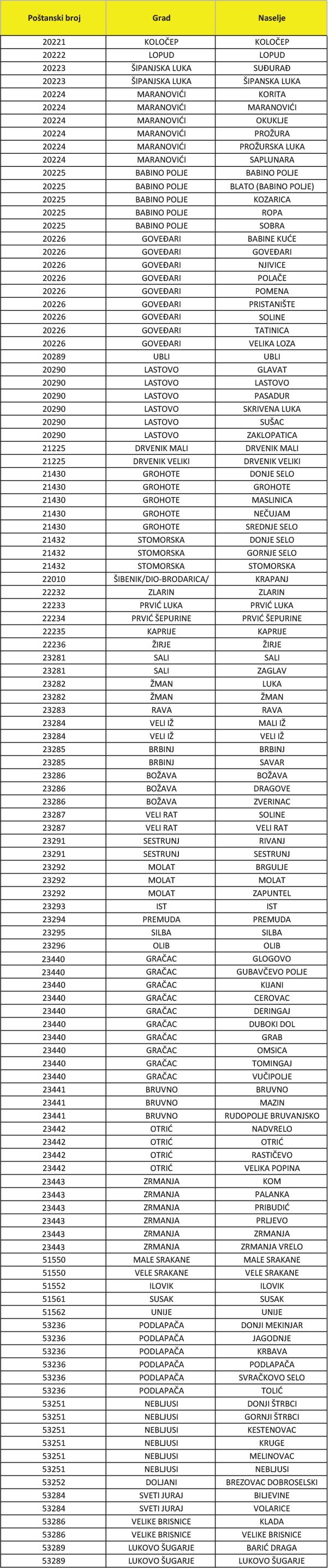 Ukoliko se nalazite u dolje navedenim mjestima, i dalje možete dobiti naše proizvode, ali opcije plaćanja su kartica ili internet bankarstvo (virman).